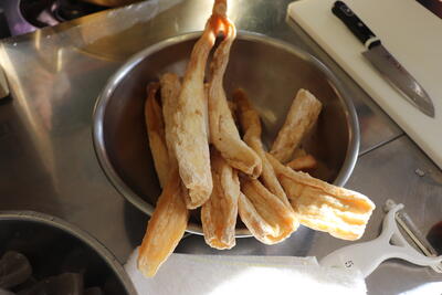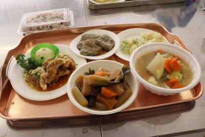 本日のメニューは、油淋鶏風からあげ・野菜たっぷり豚汁・ネギと桜エビのかき揚げ・凍み大根とにしんの煮物