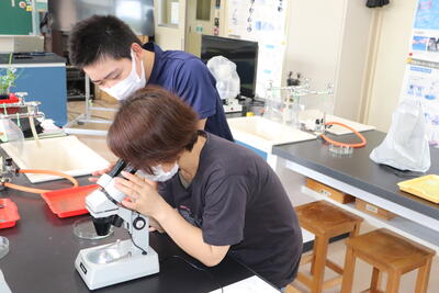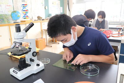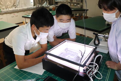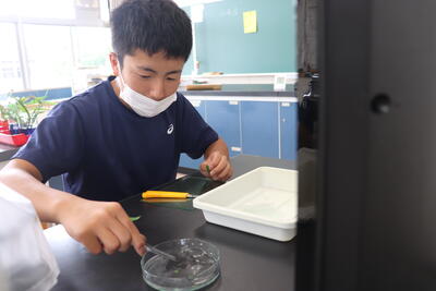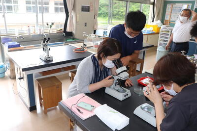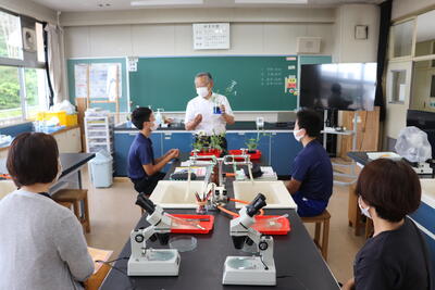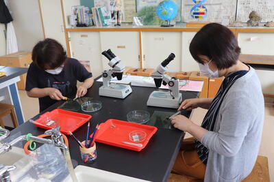 2年生の理科は、植物の「水の通る道」を観察する実験です。お母さん方も、生徒です。