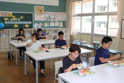 給食は親子並んで食べました。(1組は親子のような担任と生徒です)