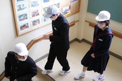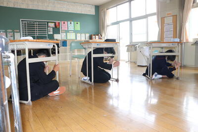 避難開始!無言で真剣に避難します。避難後、校長先生から、「命を守る訓練や教室を大切にしてほしい」、「本日が東日本大震災から11年と2ヶ月に当たる日であることから、東日本大震災を風化させないでほしい」 というお話をいただきました。