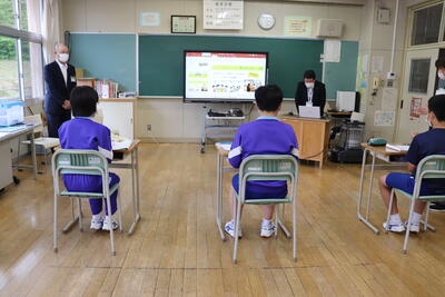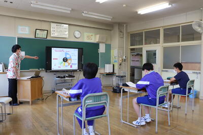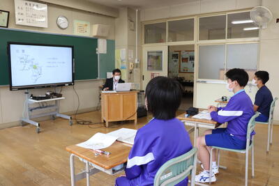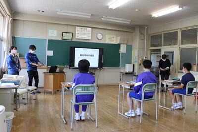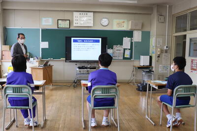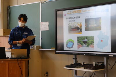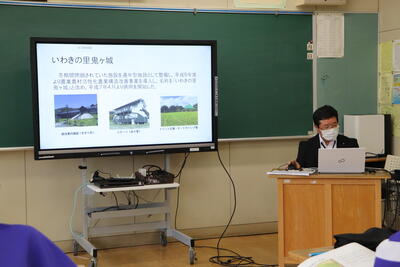 いわき市川前支所の職員の方が2名来校し、地形や歴史、特産品など川前町について詳しく説明してくださいました。