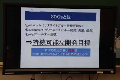 1コマ目では、SDGsについて詳しく説明を受け、目標達成を目指す8年後の世界や日本、地域、自分の姿を想像し、どんな未来にしたいか「自分ごと・自分なり」に考えることの大切さを学びました。