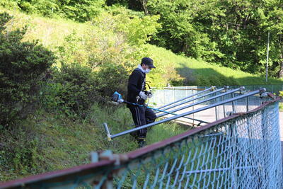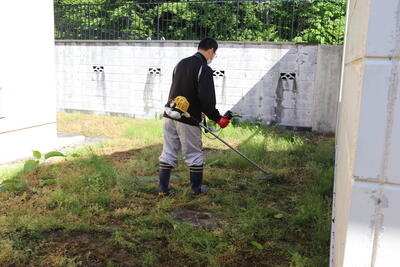 早朝から、児童・生徒、保護者の皆様、卒業生の保護者の方にもお集まりいただき、プール清掃と草刈りを行いました。