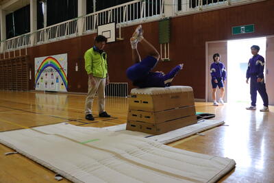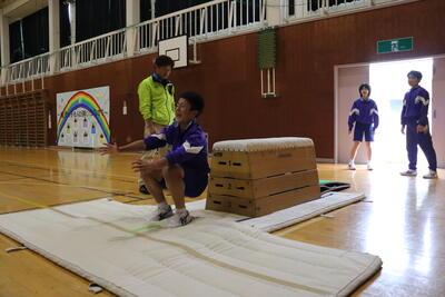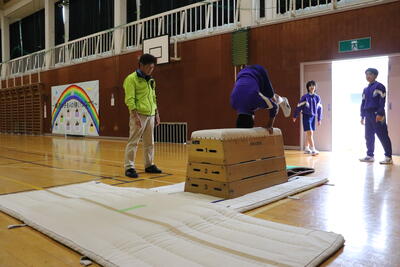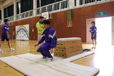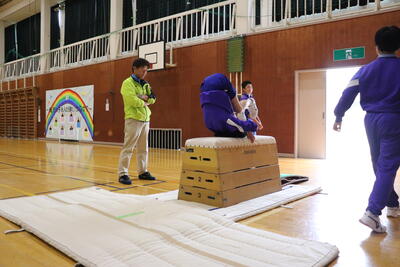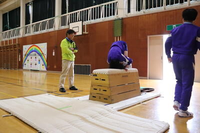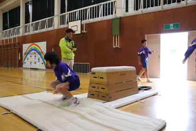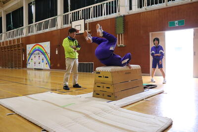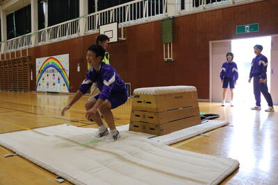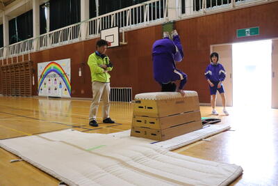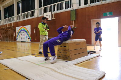本日の体育は、跳び箱。台上前転を行いました。