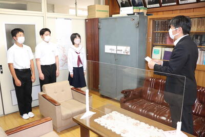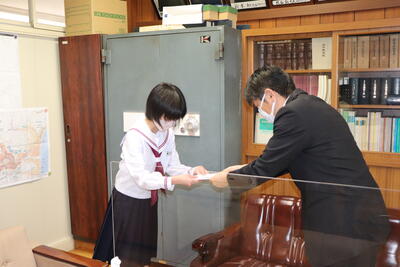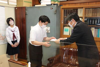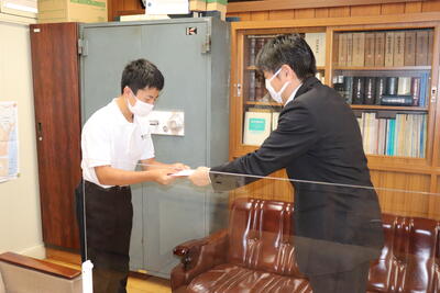 校長室にて、校長先生から激励の言葉とともに、お守りをいただきました。