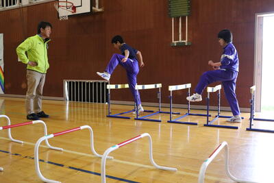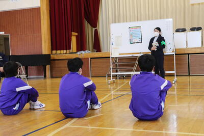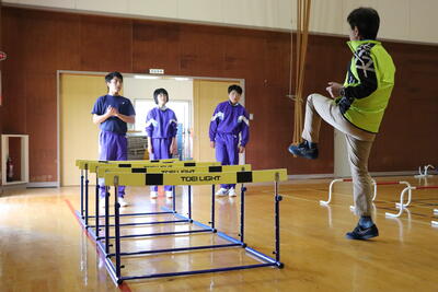 今日は、小中合同の体育で、リレーのバトンパスの練習を行います。まずは、先生からテイクオーバーゾーンやバトンの渡し方、走り出すタイミングについて、教えてもらいました。