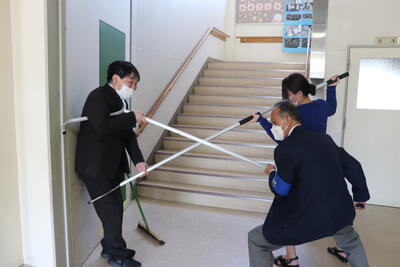 スクールサポーターの方から、さすまたを使っての取り押さえ方を教えていただきました。