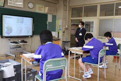 1コマ目は、旧石器時代までさかのぼり、いわき市で発掘された遺跡や土器などについて詳しく教えていただきました。生徒たちは、メモを取りながら、真剣に聞いています。