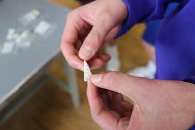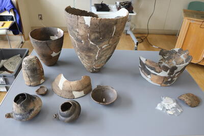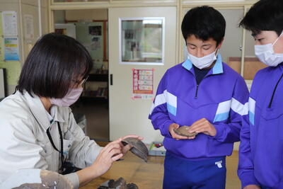 実際に土器を触らせていただきました。生徒たちは、約9000年も前に作られた土器や狩猟に使われていた矢じりなどに触れ、先人の生活を感じ、興味関心を高めていました。
