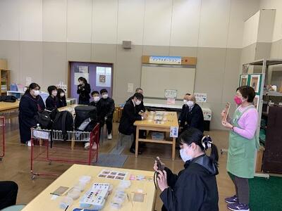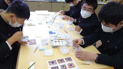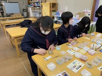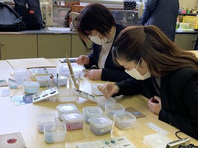 秋田ふるさと村にある「手づくりスタジオ」にて、「七宝焼」の体験活動を行っています。係の方の説明を聞き、ベースの色を決め、その上に飾りを施します。自分の思い描いた作品となったことでしょう。