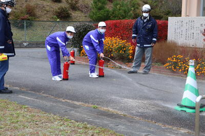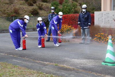 また、消防体験として、消火器使用体験、屋内消火栓による放水体験を行いました。