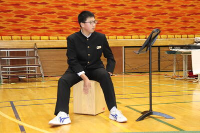 カホンは、それ自体にまたがって演奏する楽器で、叩く面や位置によって違った音が出ます。今回の合奏では、全体のリズムをとってくれました。