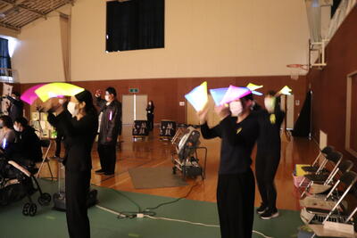ビッグアートは、後ろに止めた紐をカットしての披露でした。児童生徒8人の強いつながりを虹にたとえ、8色の虹で表現しました。