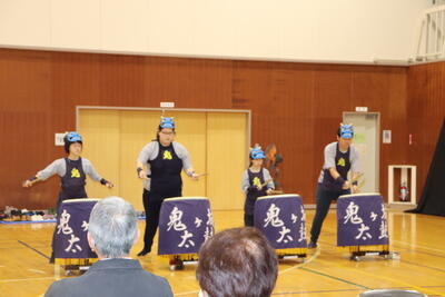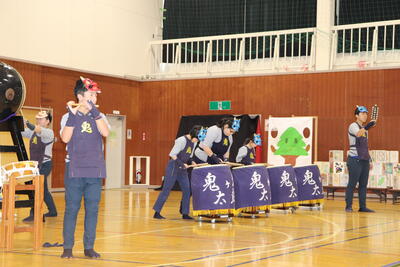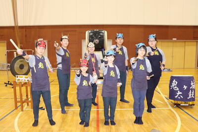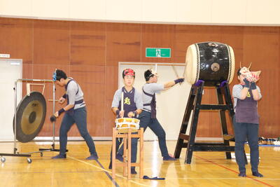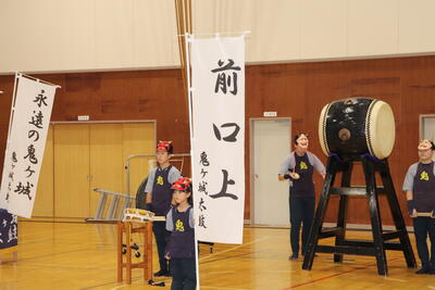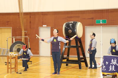 桶売中学校に伝わる伝統芸能「鬼ヶ城太鼓」。今年3月の聖火到着式でも披露しました。