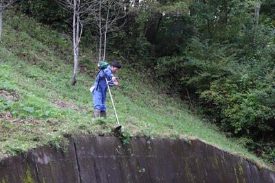 険しい斜面もなんのその。草刈り機を使ってきれいに除草していただきました。