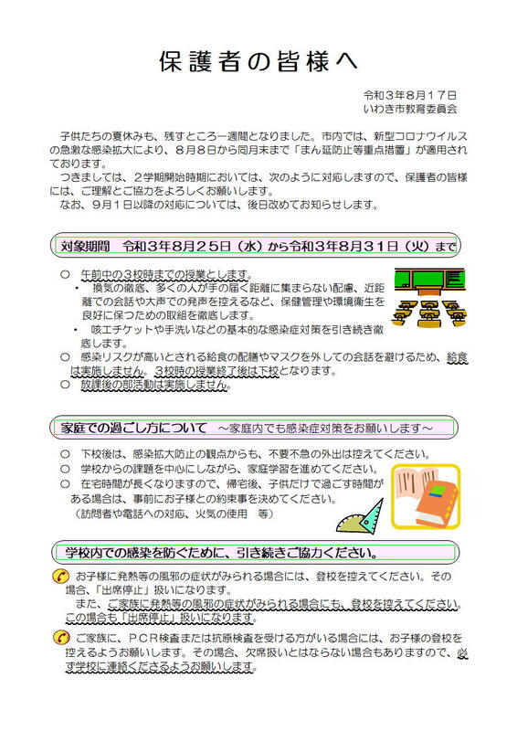 いわき市教育委員会より2学期開始時期の対応について保護者の皆様へお知らせがありました。すでに連絡メールでも対応についてご連絡いたしましたが、改めてご確認いただきますよう、よろしくお願いします。