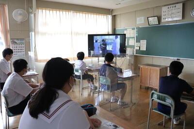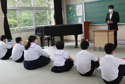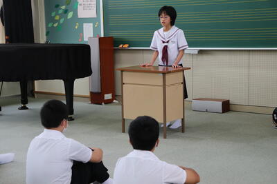 校長先生の話を真剣な表情で聞く生徒たち。いわき市をとりまく新型コロナウイルスの現状について、制限のかかる生活となりますが、感染対策をとりつつ、精一杯教育活動に取り組んでいきたいと思います。