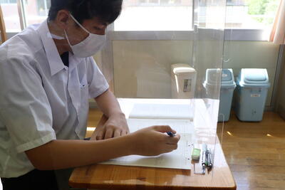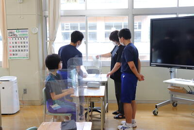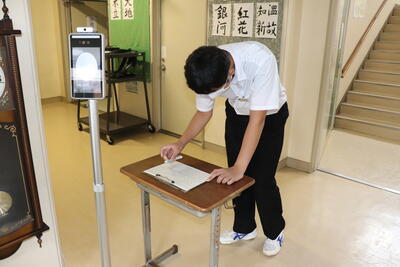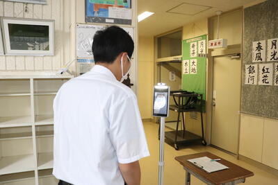 2学期より、本校では、朝の検温で「サーモマネージャー」の活用を始めました。これまでは教員が行っていた検温を、生徒自身で行えるようになりました。生徒たちは、スムーズに検温・記録を済ませていました。