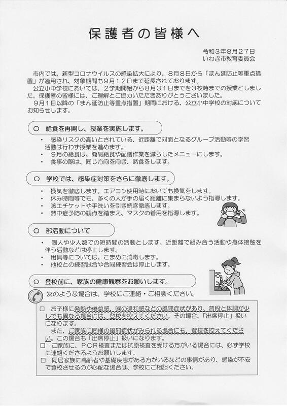 いわき市教育委員会から9月1日以降の「まん延防止等重点措置」期間における学校の対応について、以下のようにお知らせがありましたので、お伝えします。