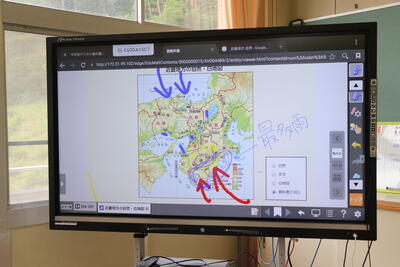 近畿地方の地形や気候について学習しました。デジタル教科書に情報を書き足しながら、考えさせる授業となっていました。