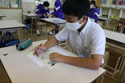 1年生は文字アートの考案をしていました。模範例を見ながら、自分なりのアレンジを考え、案をたくさんメモしていました。
