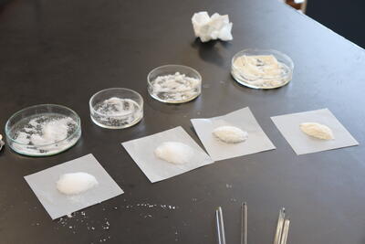 白い粉末は「砂糖」「食塩」「グラニュー糖」「デンプン」の4つです。質量を量ったり、水に溶かしたようすを観察したりと、真剣に取り組む姿が見られました。