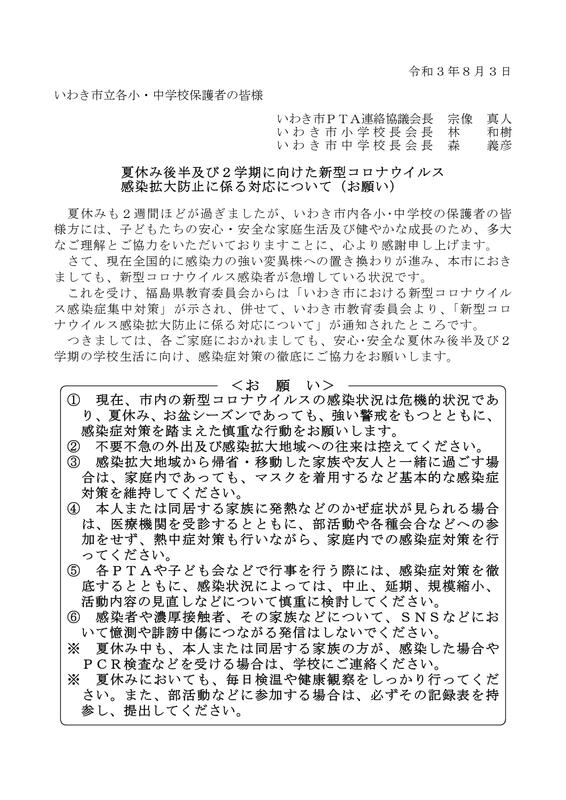 本日、いわき市PTA連絡協議会長、いわき市小・中学校長会長が連名で、保護者の皆様へお願いの文書が出されましたので、お知らせいたします。