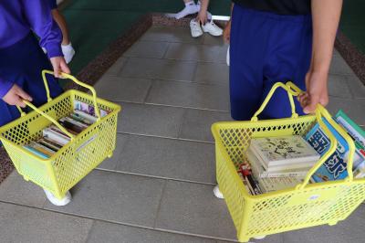 生徒たちは思い思いに本を手に取り、かごに入れていきます。