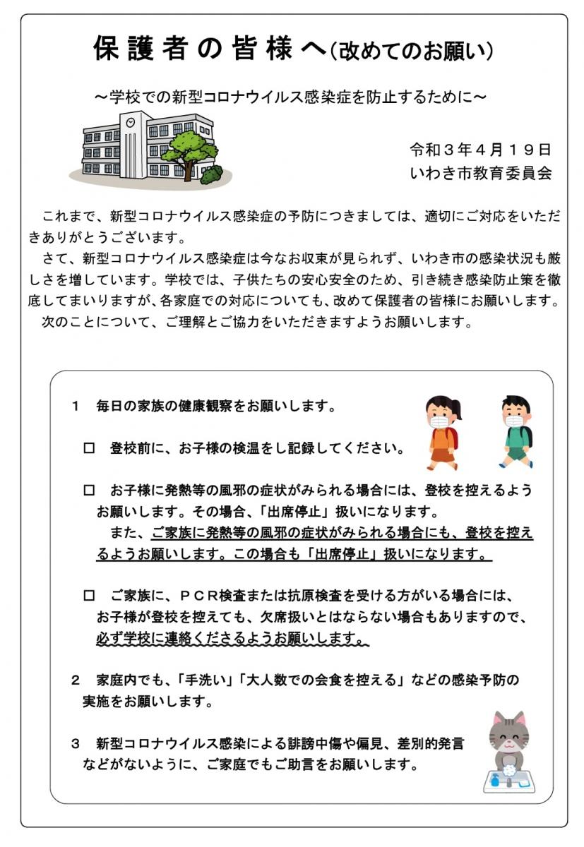 2021年4月22日 19時33分本日、いわき市教育委員会より、全国的に新型コロナウイルス感染が広がっている状況を踏まえ、学校における感染拡大を徹底して防止することから、前回に引き続き、保護者向け資料が送付されてきました。