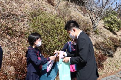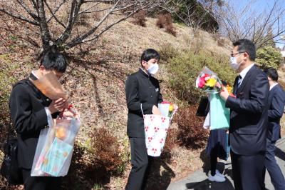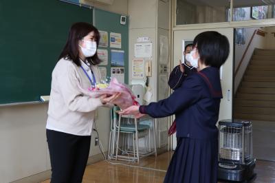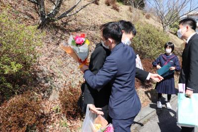 いよいよお別れ、お見送りです。生徒たちは花束や色紙を手渡し、感謝の気持ちを伝えていました。