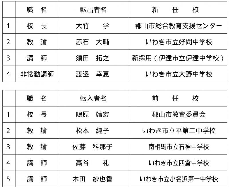 令和2年度末の人事異動によりまして、下記の教職員が転出・転入することとなりましたのでお知らせいたします。