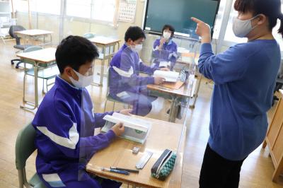 <1年生の英語> 緊張のようすが、姿勢からも伝わります。
