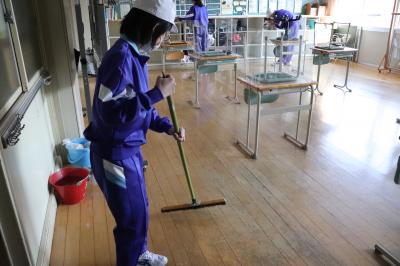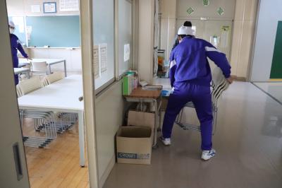 今日の清掃場所は教室です。椅子を机上に上げたり、廊下に出したりして、清掃スペースをつくります。ほうきや水モップを使って床を清掃します。