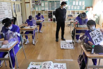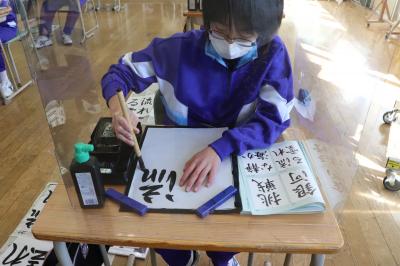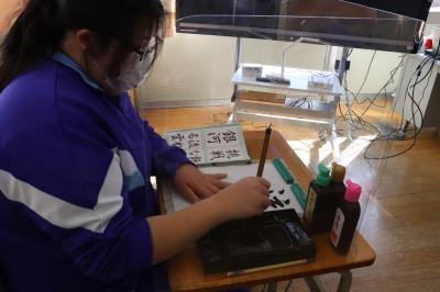 行書で書かれた手本をもとに、流れるような筆運びを意識して、筆を動かしていました。