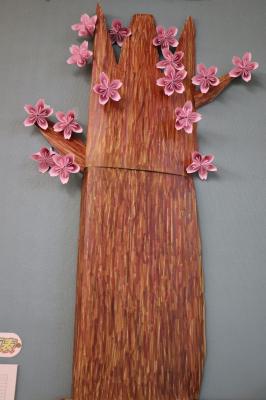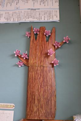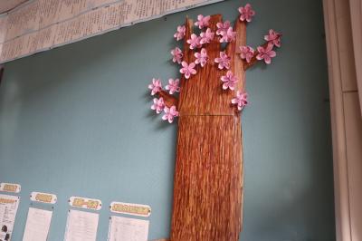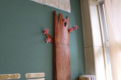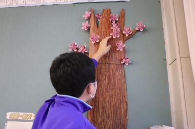 3年生の教室に掲示された桜の木。これから少しずつ花をつけていき、卒業式には満開の花となってくれるでしょう。