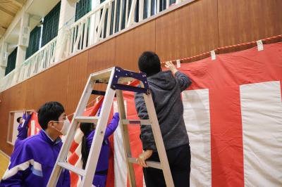本日は、会場となる体育館に紅白幕・看板を設置し、フロアマットを敷きました。