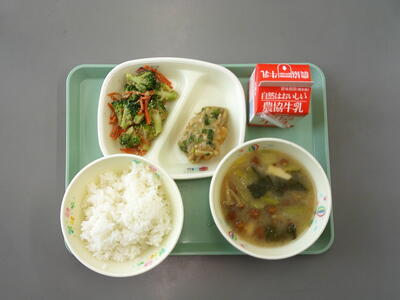 今日の給食のメニューは、ごはん、牛乳、揚げ豆腐のきのこみぞれだれ、なめこ汁、ブロッコリーのごま和えです。今日のメニューには、なめこ、えのきたけ、エリンギと、たくさんキノコが使われていますよ。
