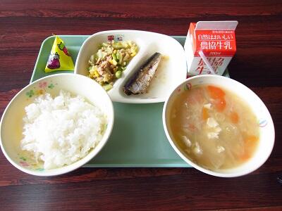 今日の給食のメニューは、ごはん、牛乳、イワシの梅煮、お豆サラダ、呉汁、福豆です。
