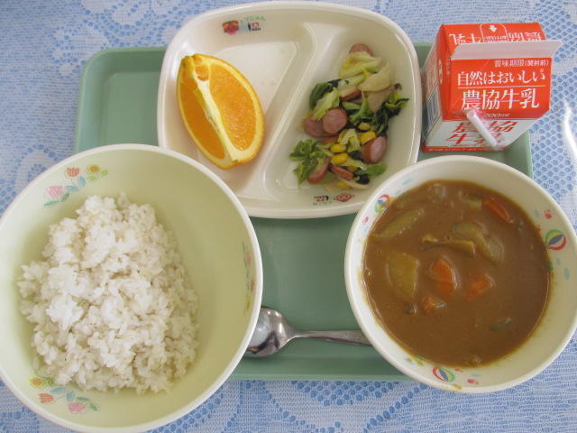 ◯ポークカレーライス〈麦ごはん〉 ◯ウインナーとキャベツのソテー ◯オレンジ ◯牛乳