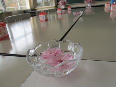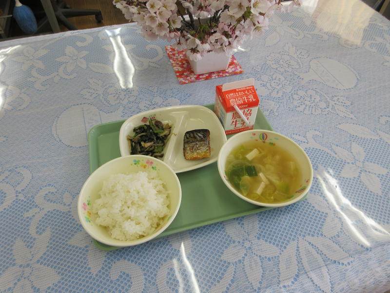 お花見をしながら給食をいただきました。特に、味噌汁の具のキャベツがとてもシャキシャキと歯ごたえがあって、桜の花びらのようにとても鮮度がよかったです。春です。