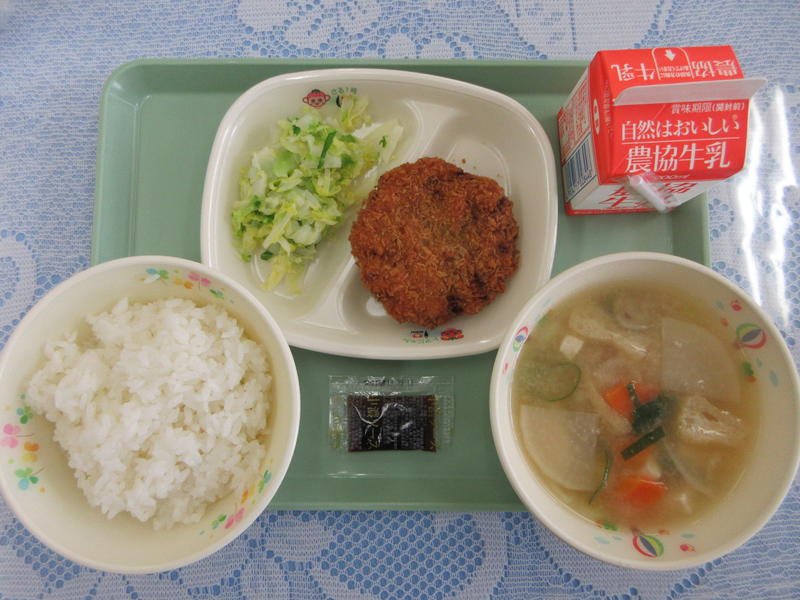 ◯メンチカツ ◯ゆでキャベツ ◯こんさい汁 ◯ごはん ◯牛乳