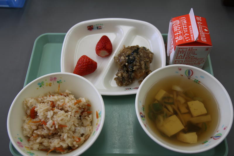 〇ツナごはん 〇わかたけ汁 〇あげどうふのそぼろあんかけ 〇いちご 〇牛乳