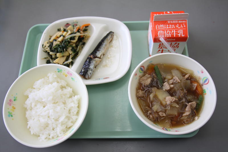 〇ごはん 〇たけのこのゴマ和え 〇いわしのおろし煮 〇肉じゃが 〇牛乳