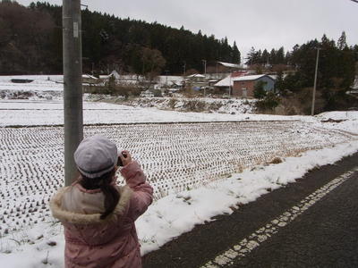 前日からの季節はずれの雪で町が真っ白に雪化粧する中、3学年の児童が社会科の町探検を行いました。