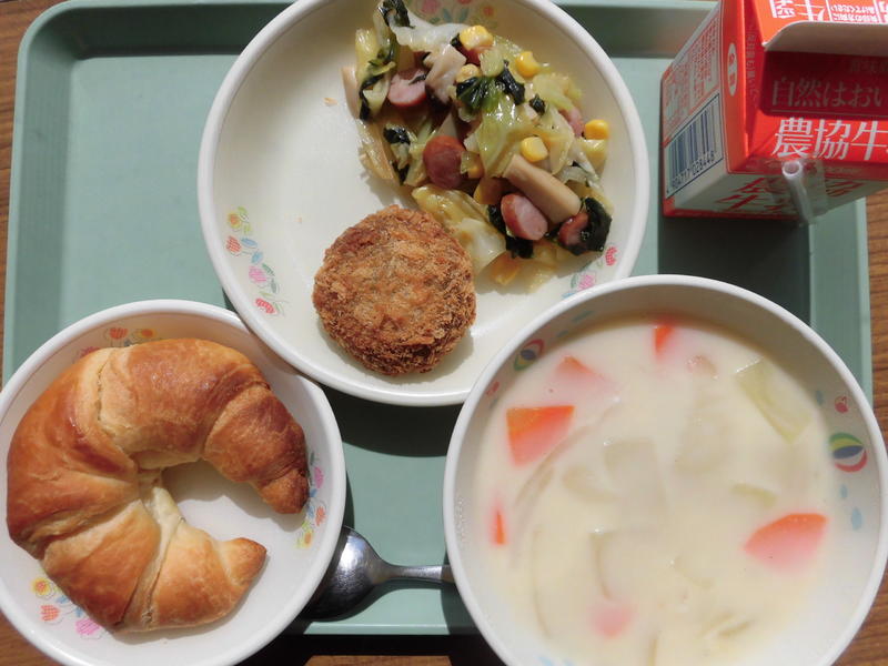 ほんのり温かいクロワッサンは、給食室のオーブンで温め直したもので、クロワッサン本来のサクサク感と濃厚なバター風味が堪能できました。給食のパンで「こんなのはじめて」です。