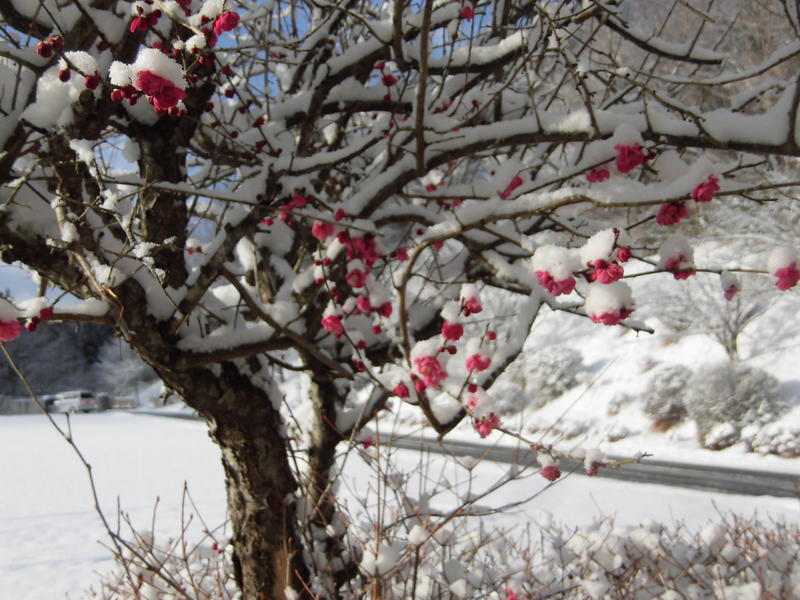 2週間前に咲いた紅梅も「何ごと?」と首を傾げているよう。