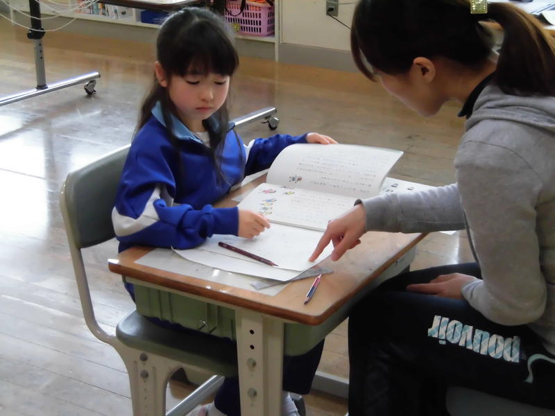 2年生は文集づくり。ときどき教科書に戻り効果的な書き方について確かめています。