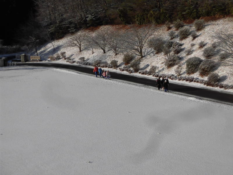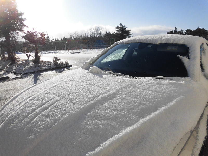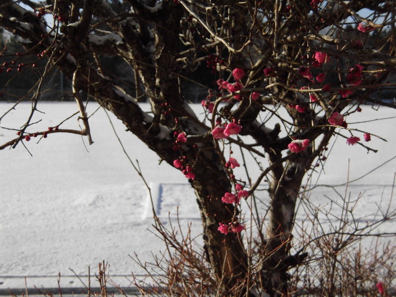 2019年3月8日 07時52分昨夜の冷たい雨は、夜半には桶売を白く染めたようです。春を告げた紅梅も戸惑っているよう。