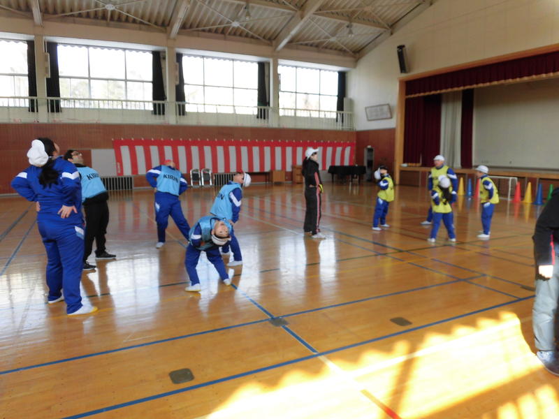 入念に準備運動を行って・・・。チームごとに考えたウォーミングアップを行っています。