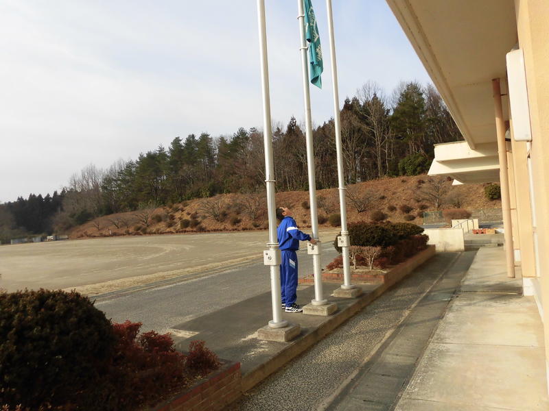 当番の子が毎朝掲揚する校旗。見上げる先の図柄には先人の思いが込められています。